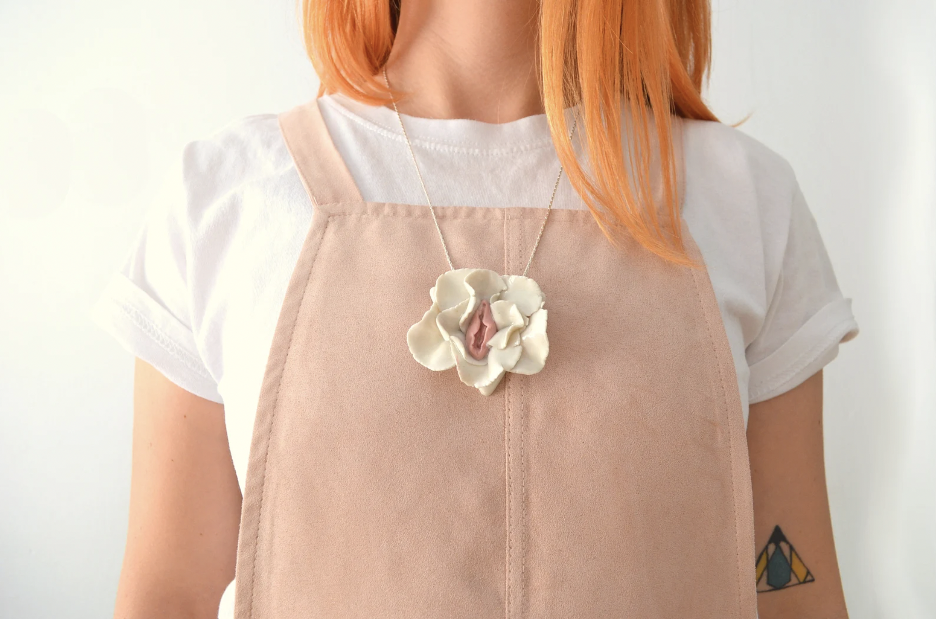 Pingentes de flores de porcelana. É uma peça inspirada nas obras da pintora Georgia O´keefie em que ela retratou flores de diferentes perspectivas e abordagens sendo interpretadas como representações da vulva feminina. Desta forma estas peças são uma homenagem a este grande pintor americano. Esta peça pertence à coleção FÉMINA baseada na anatomia feminina para a criação de joias autênticas como homenagem ao corpo da mulher.