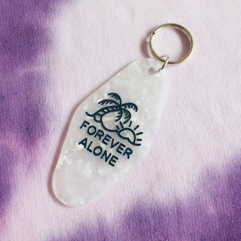 White pearlescent acrylic, laser engraved with a desert island and 'forever alone' in navy blue.