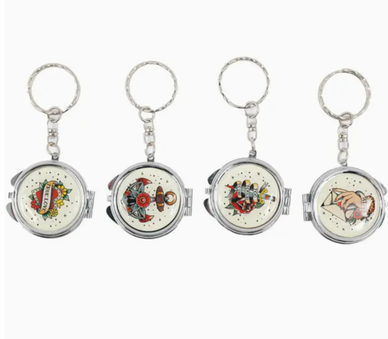 Este prático porta-chaves com espelho compacto é um acessório essencial para qualquer conjunto de chaves, garantindo que um cabelo nunca sai do lugar enquanto estiver em movimento. Com um design vintage em estilo tatuagem, este espelho é uma peça única e distinta que certamente atrairá olhares de admiração.