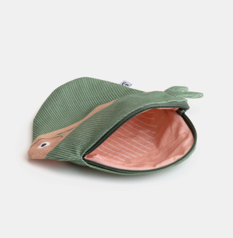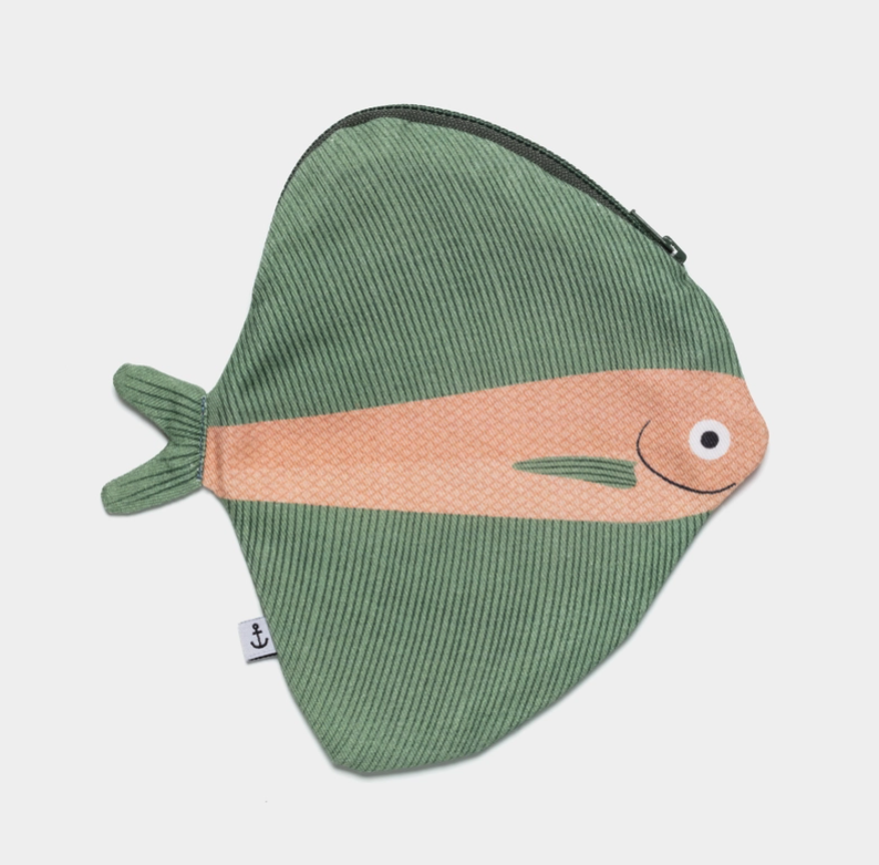 • Estojo em forma de peixe tecido verde e laranja com fecho