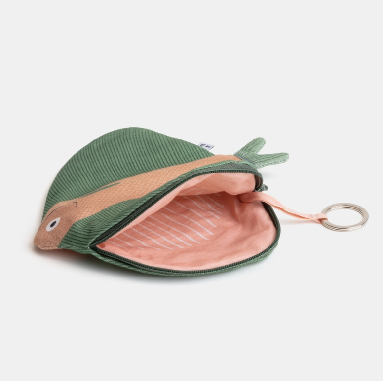 • Estojo ou porta-chaves em forma de peixe verde e rosa com fecho e argola
