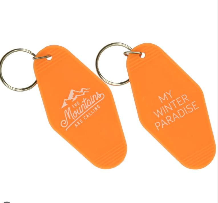 • Porta-chaves de plástico laranja com textos e argola metálica