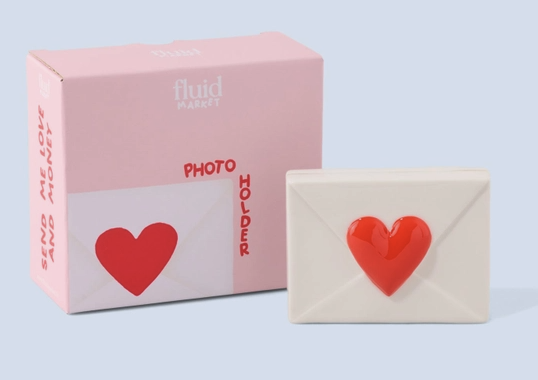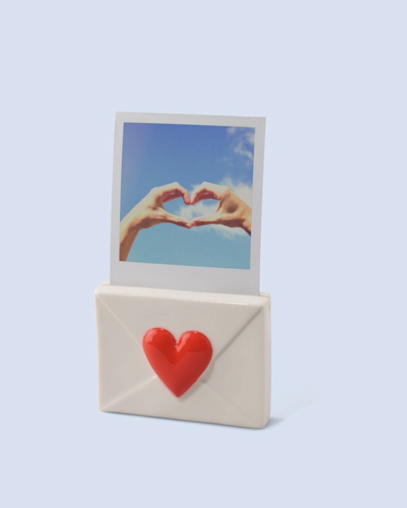 • Suporte de foto em forma de envelope com coração vermelho e embalagem rosa