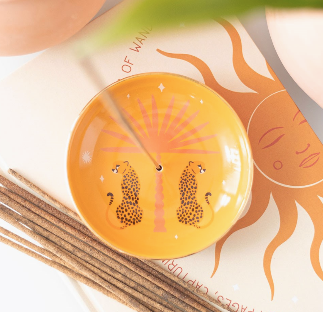 Adicione um toque elegante ao seu espaço com este Porta-Incenso Laranja Leopard Palm.