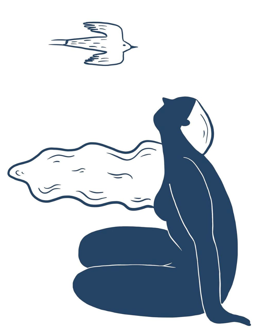 • Ilustração estilizada de uma pessoa sentada de perfil com pássaro voando