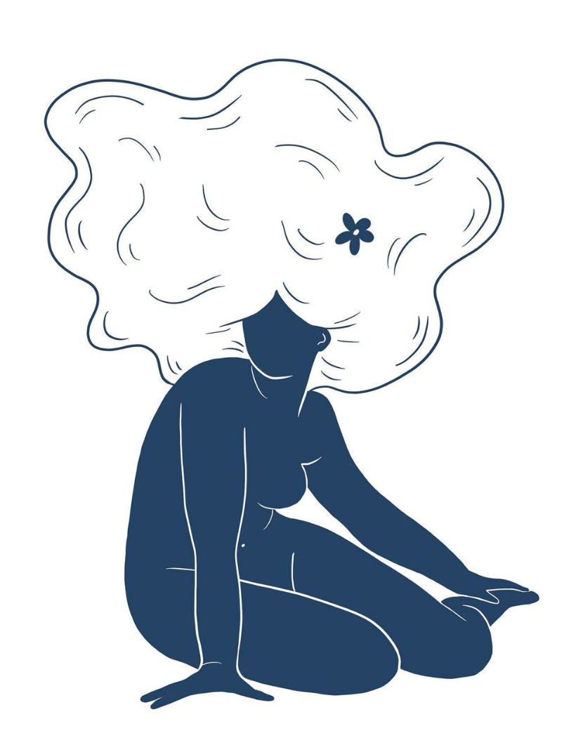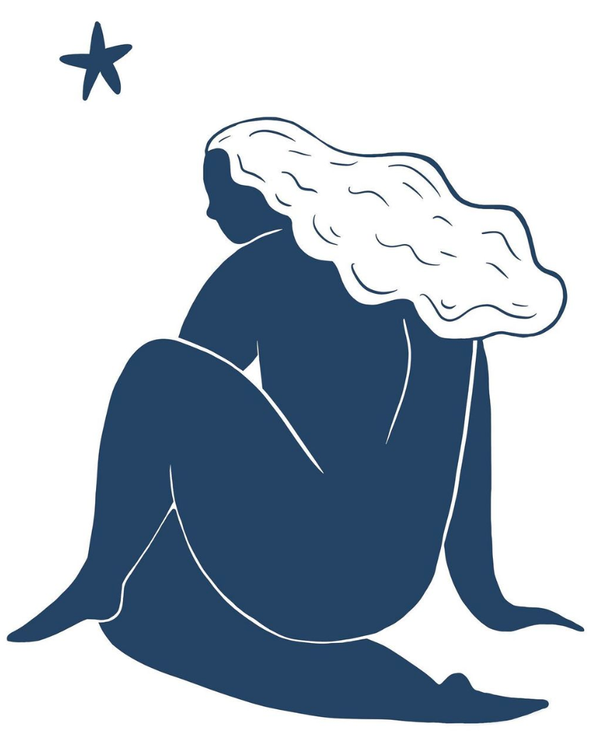 • Ilustração minimalista de mulher sentada com cabelo esvoaçante e estrela azul