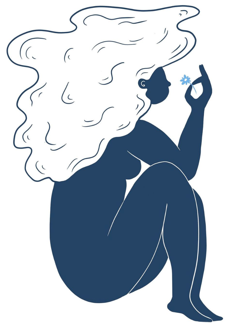 • Ilustração de figura feminina azul escuro com cabelo branco segurando flor azul