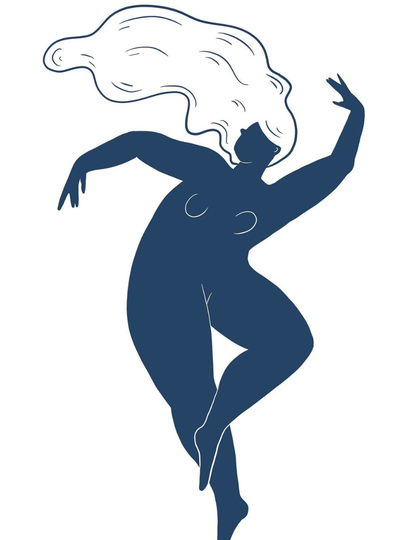 • Ilustração de figura feminina estilizada em azul escuro com cabelos brancos ondulados
