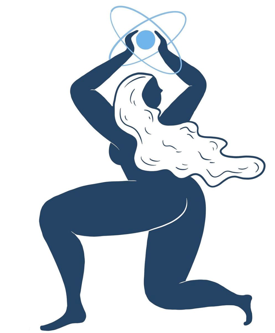 • Ilustração estilizada de figura feminina ajoelhada segurando átomo