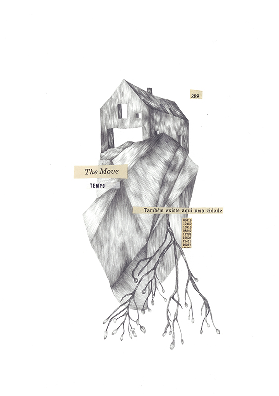 • Desenho em lápis de casa sobre rocha com raízes e recortes de texto colados