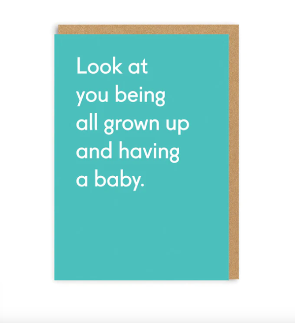 Cartão azul turquesa com texto em inglês e envelope castanho