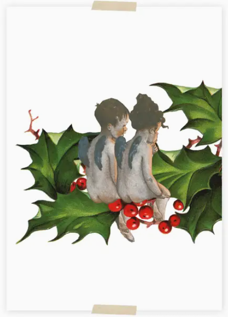 • Ilustração de bebés com asas azuis sentados em folhas verdes com bagas vermelhas.