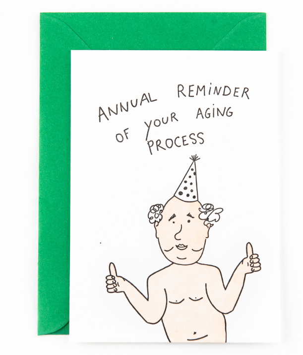 • Cartão comemorativo branco com ilustração de homem envelhecido e texto manuscrito acompanhado de envelope verde