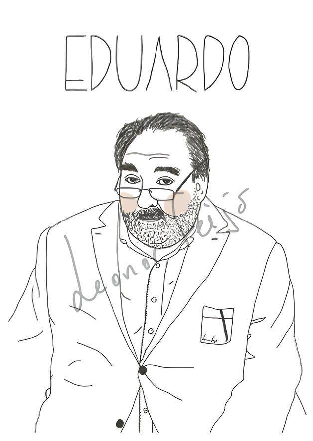 • Desenho a traço de homem de blazer branco com óculos e barba, nome 'EDUARDO' acima