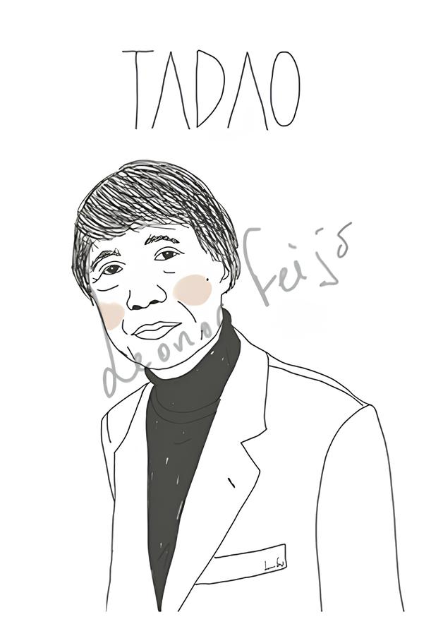 • Desenho digital de pessoa com blazer branco e camisa preta, texto TADAO acima e assinatura sobreposta