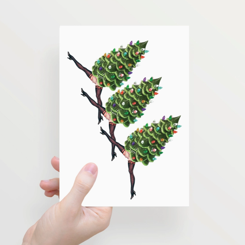 • Cartão postal com ilustração de árvores de Natal com pernas femininas.