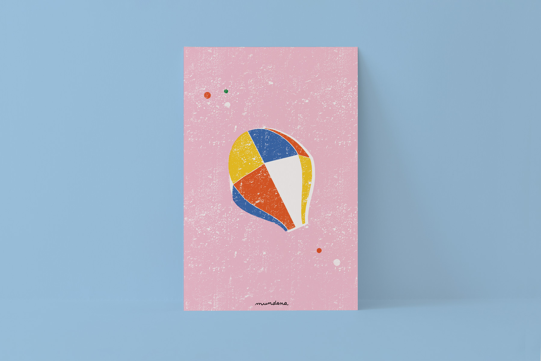 • Cartaz decorativo com balão colorido sobre fundo rosa apoiado numa parede azul claro