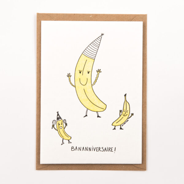 • Cartão de saudação com ilustração de bananas e texto BANANNIVERSAIRE