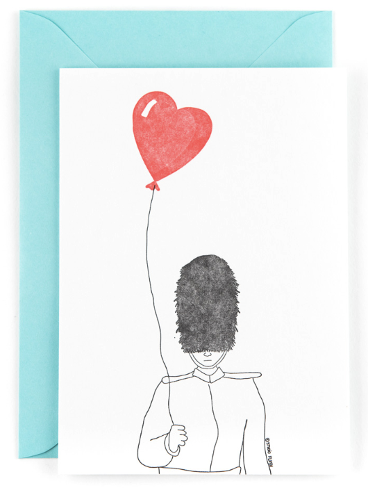 • Cartão com desenho de guarda da rainha a segurar balão em forma de coração vermelho.