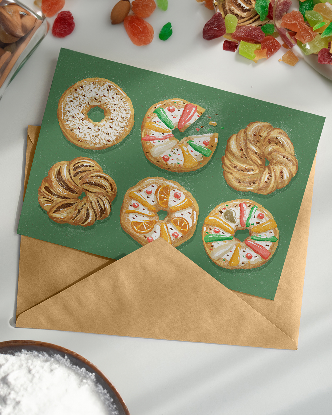 • Cartão postal com ilustrações de bolos e doces coloridos sobre envelope castanho claro