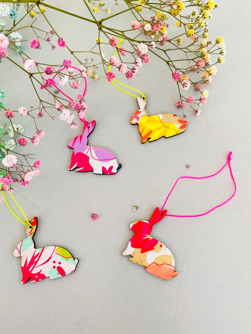 Os pendentes são impressos numa mistura de padrões e não há dois iguais. O cartão é cuidadosamente desenhado e apresenta uma etiqueta destacável feita de madeira certificada pelo FSC, que foi impressa à mão e depois anexada ao cartão.