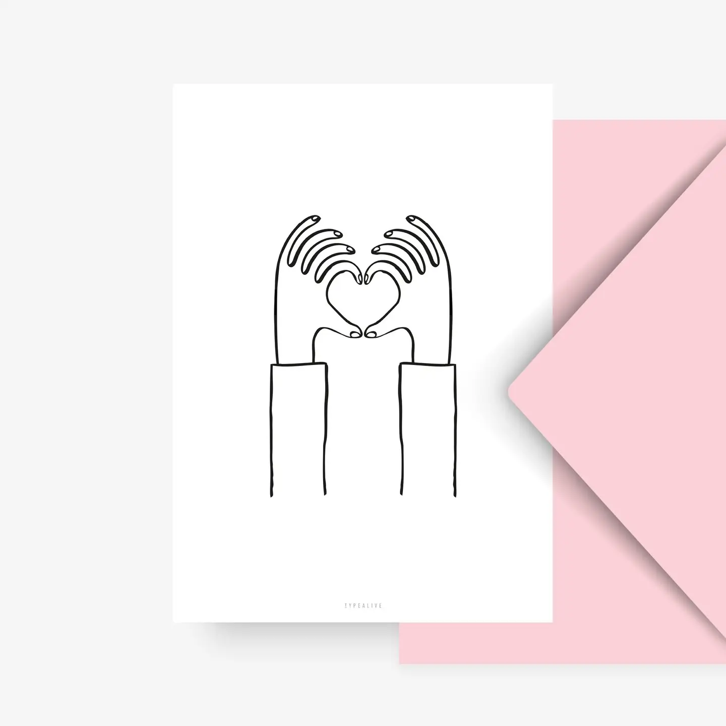 • Desenho minimalista de mãos formando um coração em papel branco com envelope rosa claro.