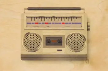 • Rádio portátil retro bege com colunas redondas, cassete e antena