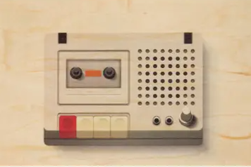 • Gravador de fita cassete vintage bege com botões coloridos e alto-falante numa superfície de madeira