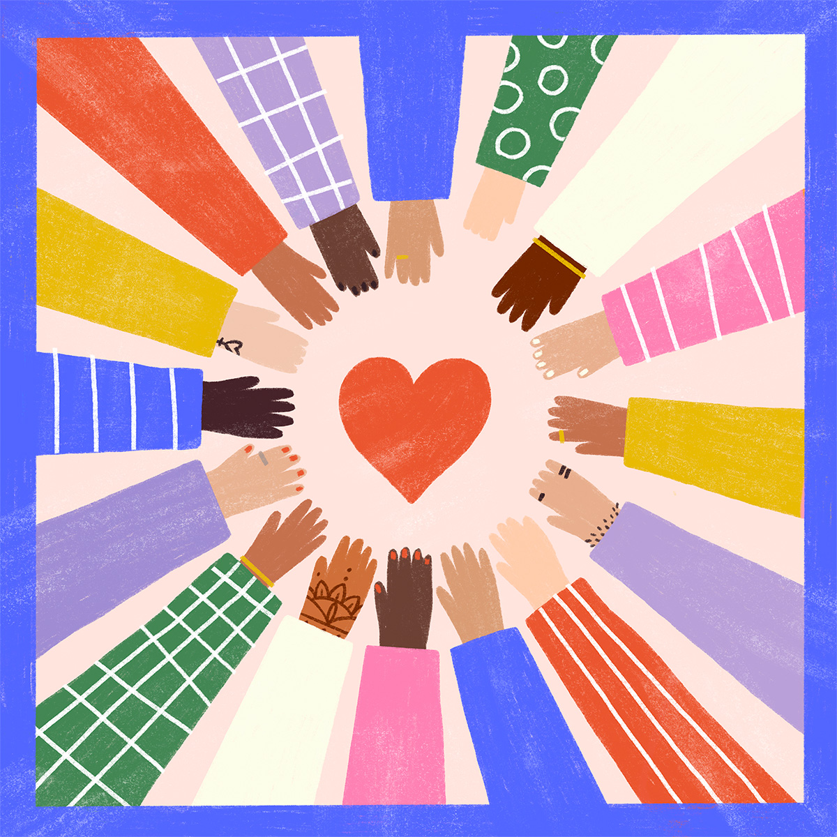 A ilustração celebra a força coletiva das mulheres através do gesto de dar as mãos. Cada mão representa diversidade, apoio e partilha, unindo-se num movimento contínuo e sem barreiras (geográficas, geracionais e culturais).