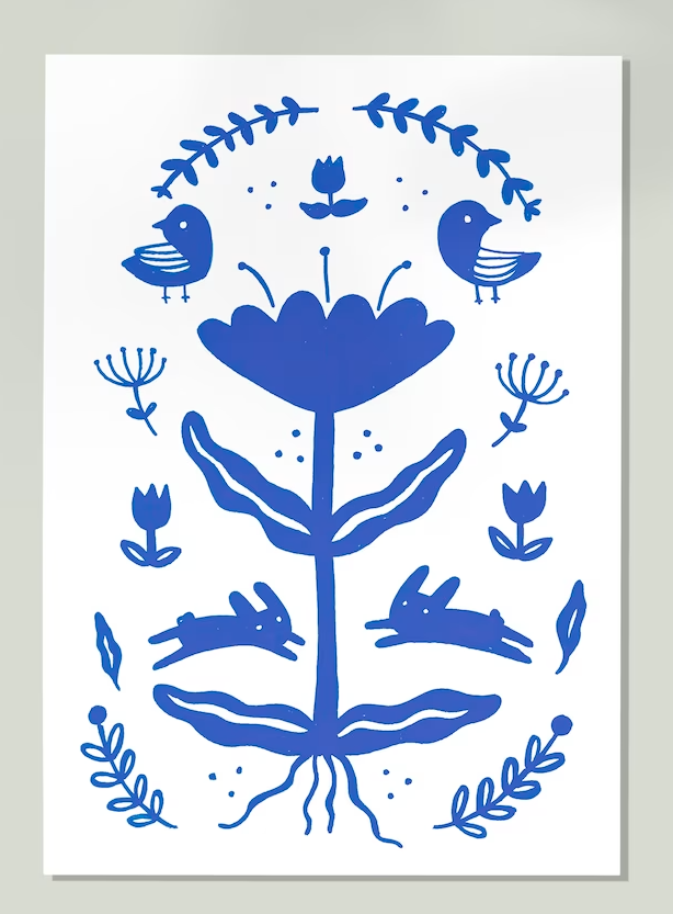 • Desenho azul de flor, coelhos, pássaros e elementos florais em papel branco