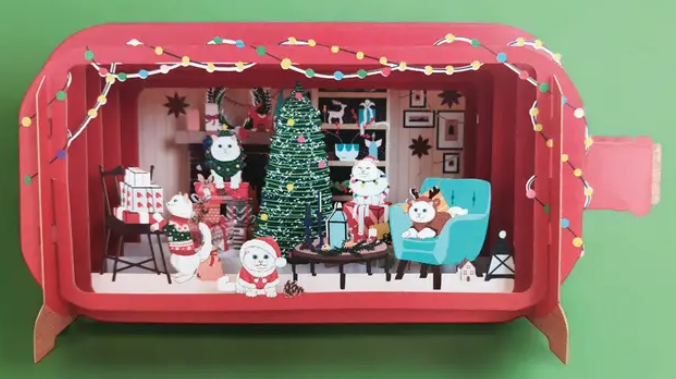 Ao abrir o postal, aparece uma pequena cena de Natal dentro de uma garrafa de papel tridimensional.