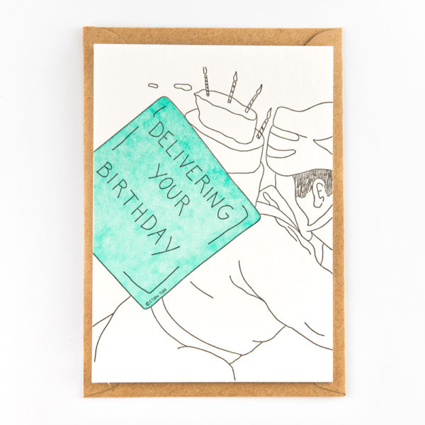 • Cartão de aniversário com ilustração de entrega de bolo e texto DELIVERING YOUR BIRTHDAY
