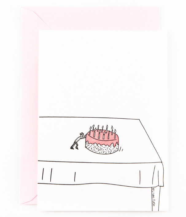 Cartão de aniversário com ilustração de bolo cor-de-rosa e pessoa numa mesa