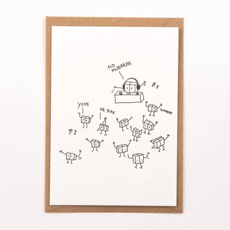 • Cartão branco com desenho de robôs e texto Eid Mubarak sobre envelope castanho.