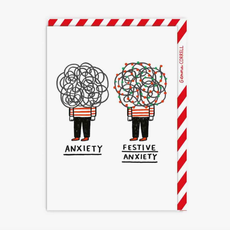 • Cartão ilustrado com figuras e texto humorístico sobre ansiedade festiva