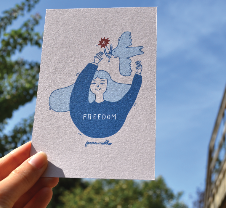 Postal com ilustração azul de pessoa e pomba com texto 'FREEDOM'