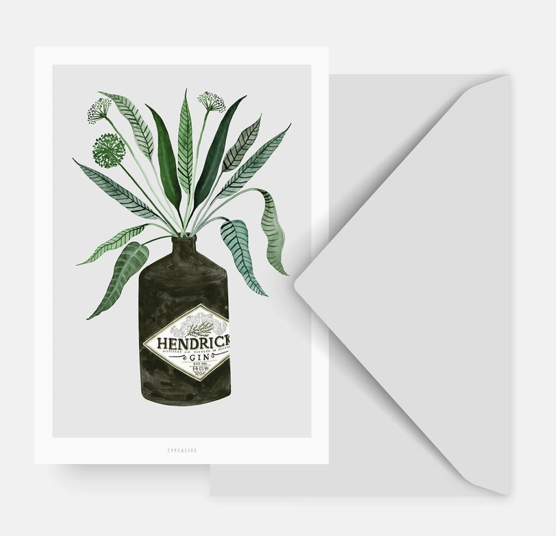 Postal com ilustração de garrafa Hendrick's gin com folhas e envelope cinzento aberto