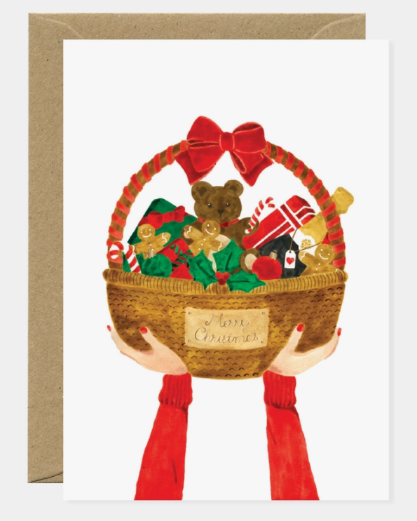 • Cartão de Natal com ilustração de cesta de Natal com ursinho e presentes