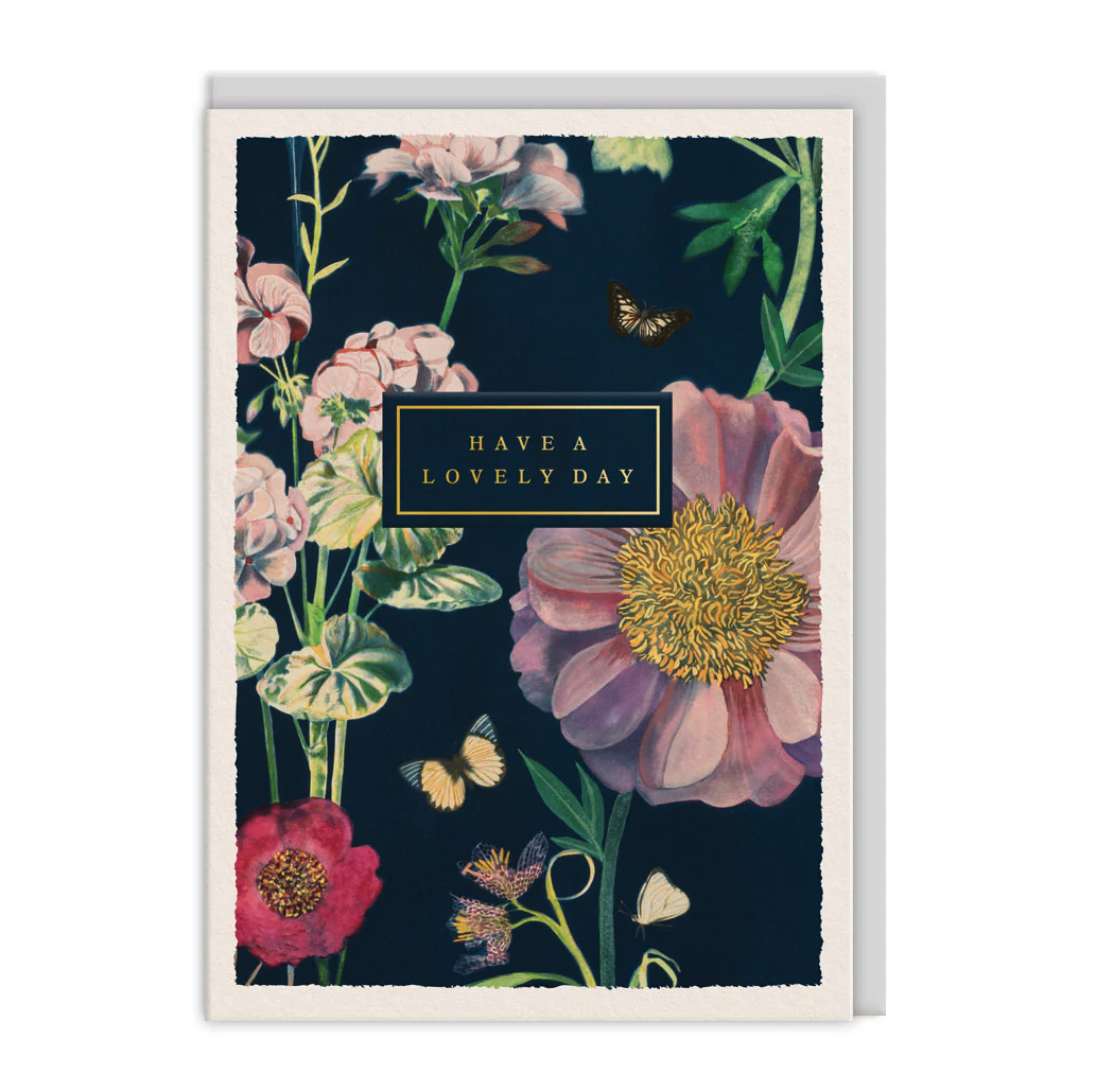 Cartão azul com flores, borboletas e texto HAVE A LOVELY DAY