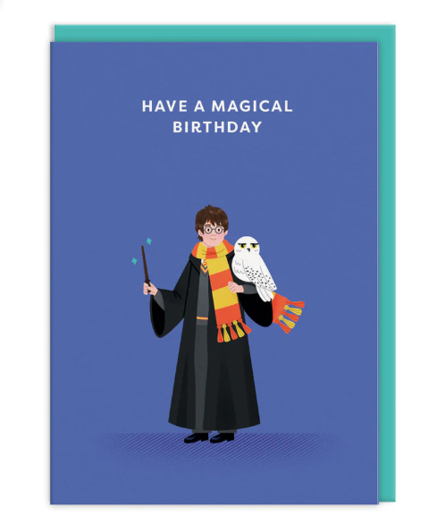 • Cartão de aniversário azul com figura mágica e coruja branca