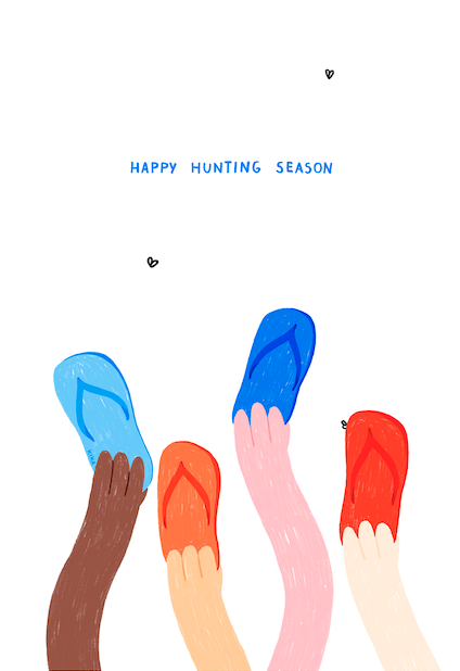 • Desenho de mãos segurando chinelos coloridos com texto 'HAPPY HUNTING SEASON'