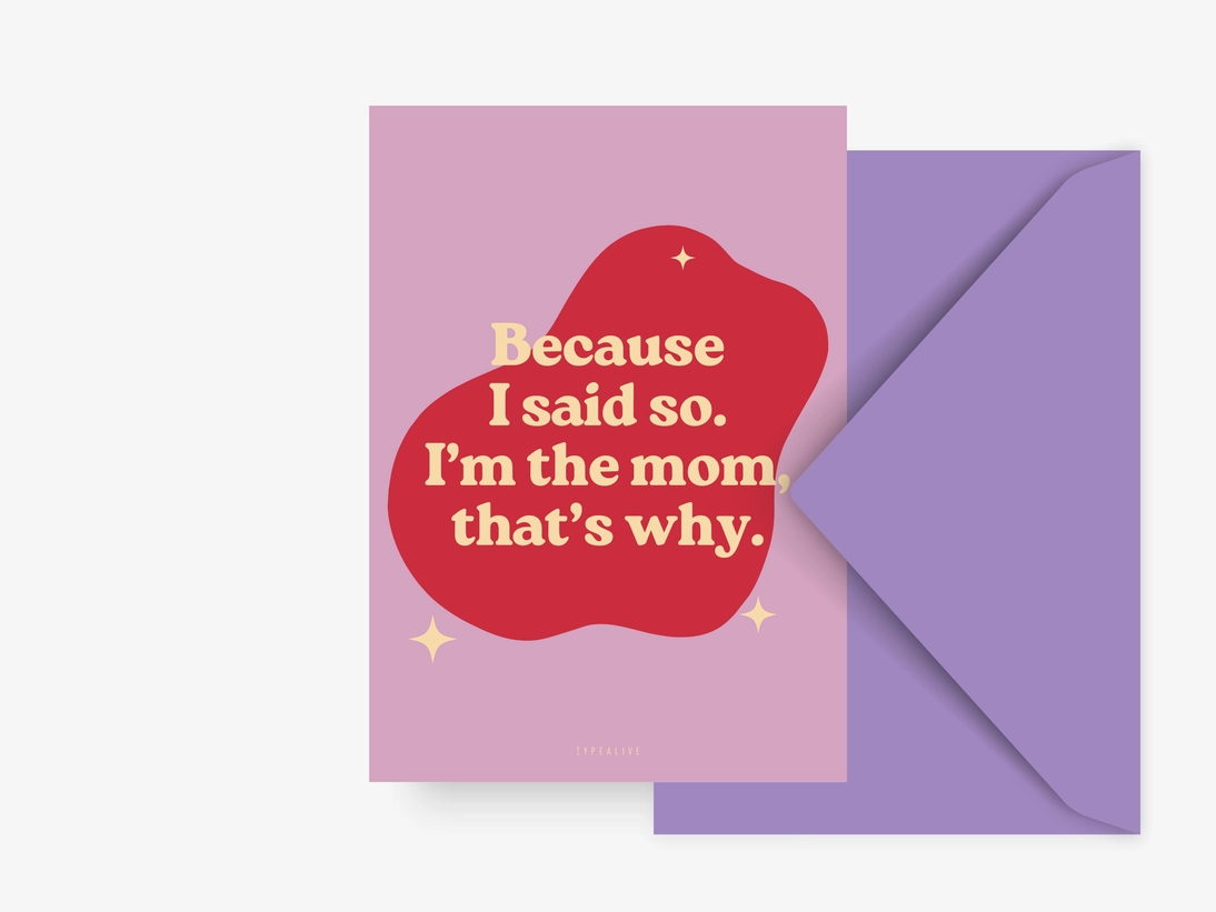 • Cartão rosa com envelope roxo e texto em inglês sobre a mãe