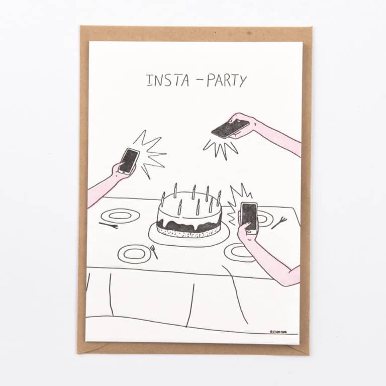 Cartão ilustrado 'INSTA-PARTY' com bolo e telemóveis