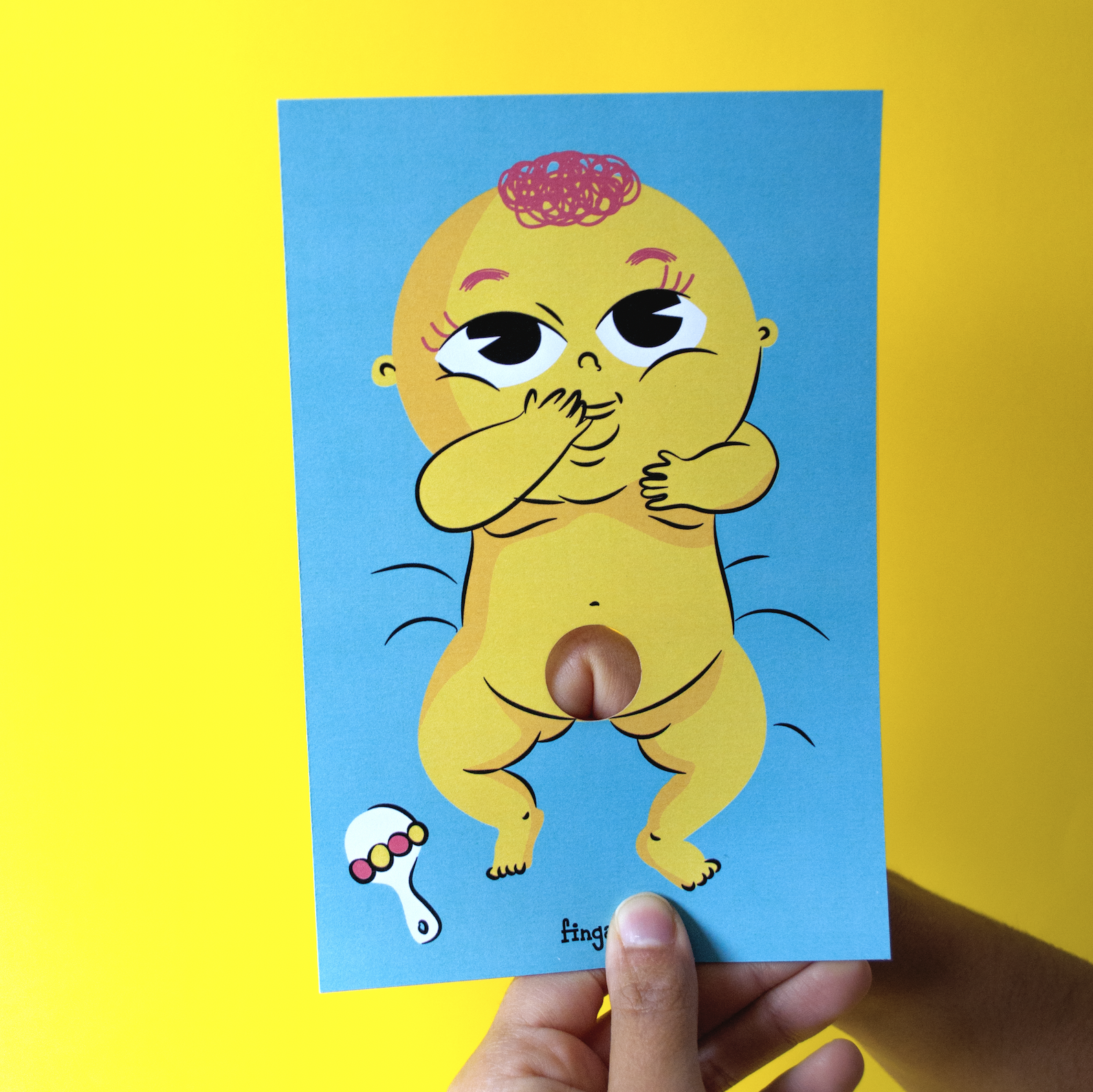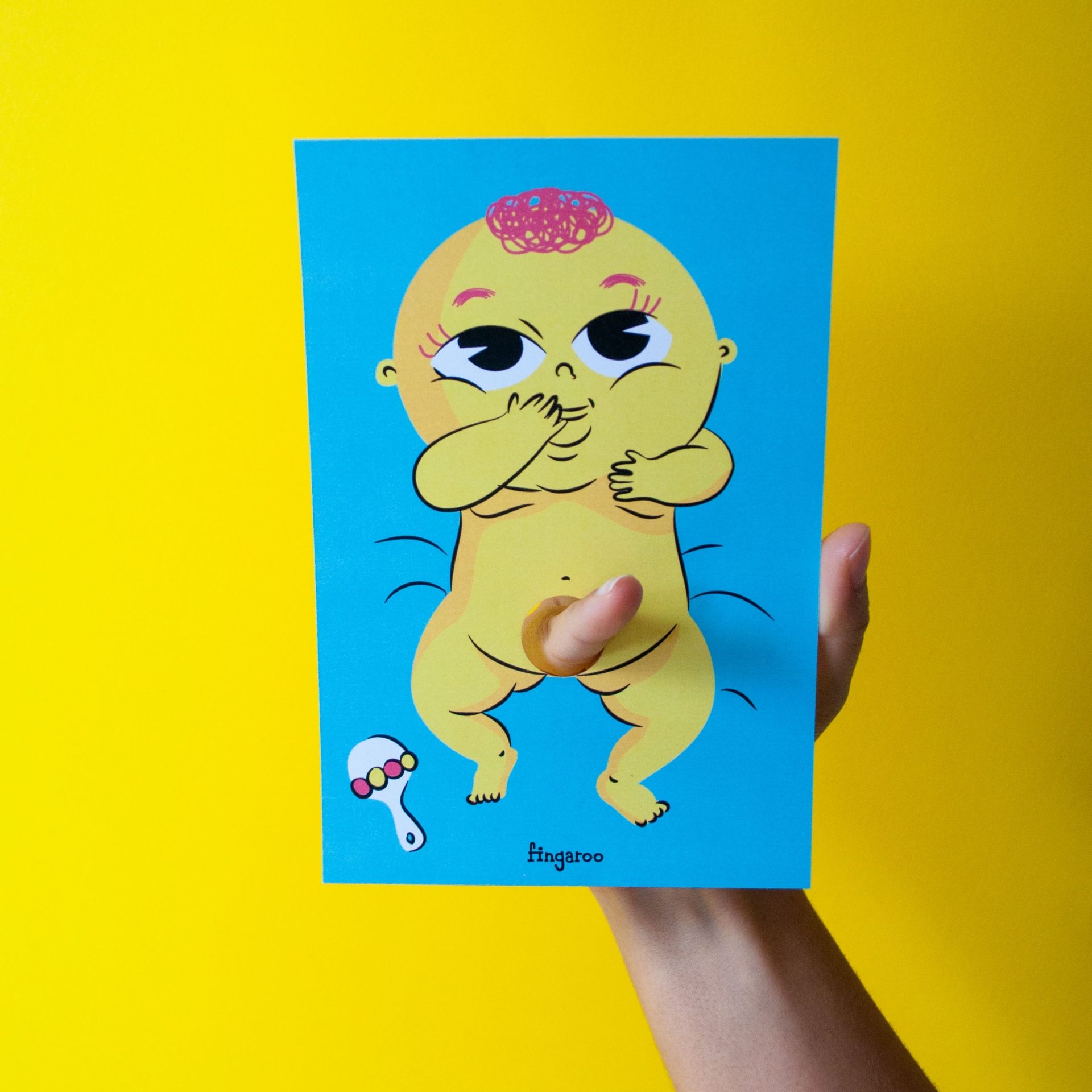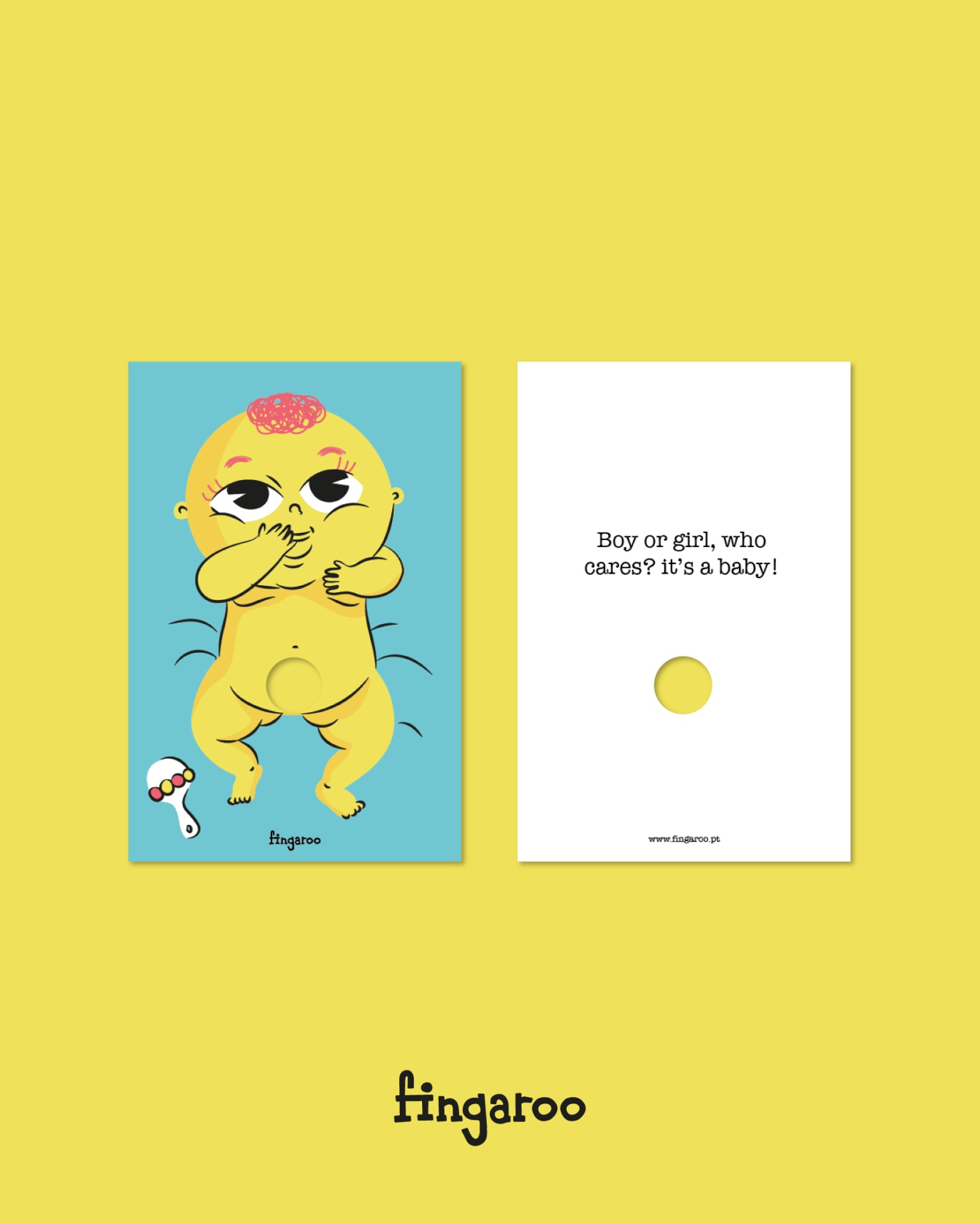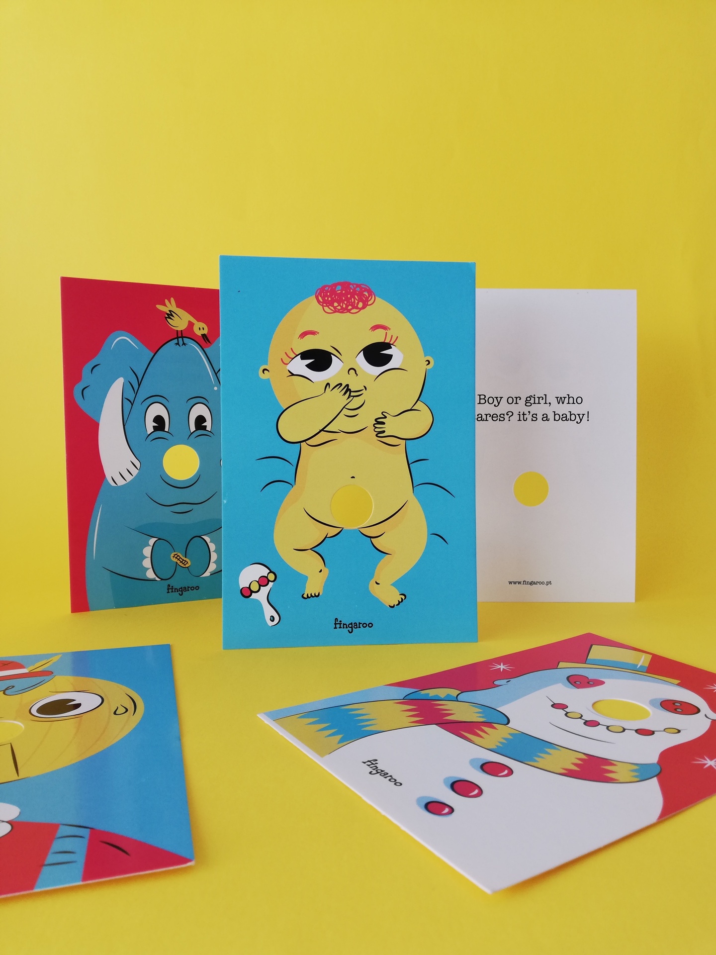 Fingaroo é uma uma série de postais-interactivos que incentivam à brincadeira, seja de crianças ou de adultos. Com um formato não convencional de 12x18cm e um furo peculiar, são postais com uma paleta de cores destinta, mas homogénea entre as suas 12 temáticas, no seu verso contém uma frase de cariz divertido, que apela à identificação das pessoas conforme o seu estado de espírito ou ocasião.