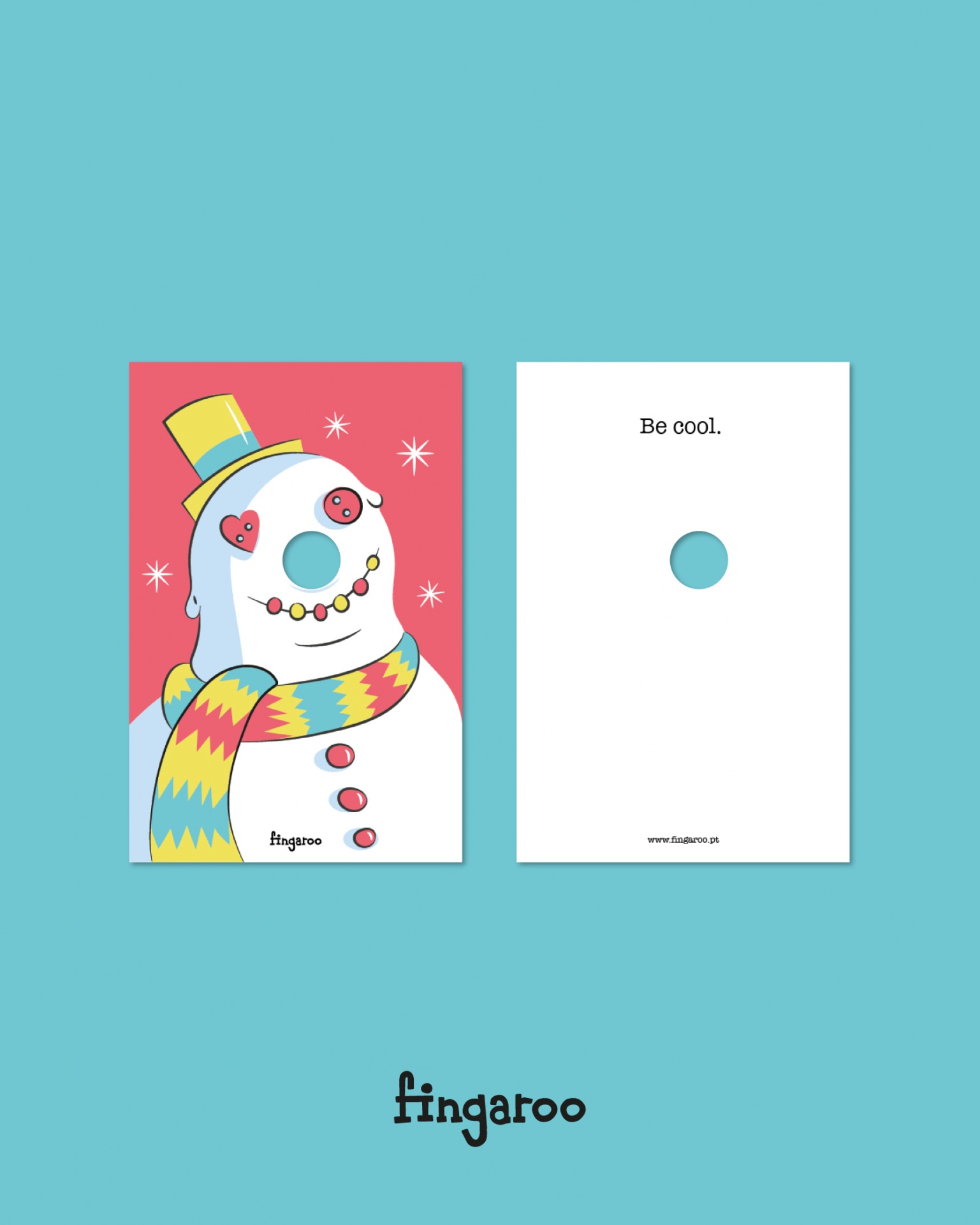 Fingaroo é uma uma série de postais-interactivos que incentivam à brincadeira, seja de crianças ou de adultos. Com um formato não convencional de 12x18cm e um furo peculiar, são postais com uma paleta de cores destinta, mas homogénea entre as suas 12 temáticas, no seu verso contém uma frase de cariz divertido, que apela à identificação das pessoas conforme o seu estado de espírito ou ocasião.