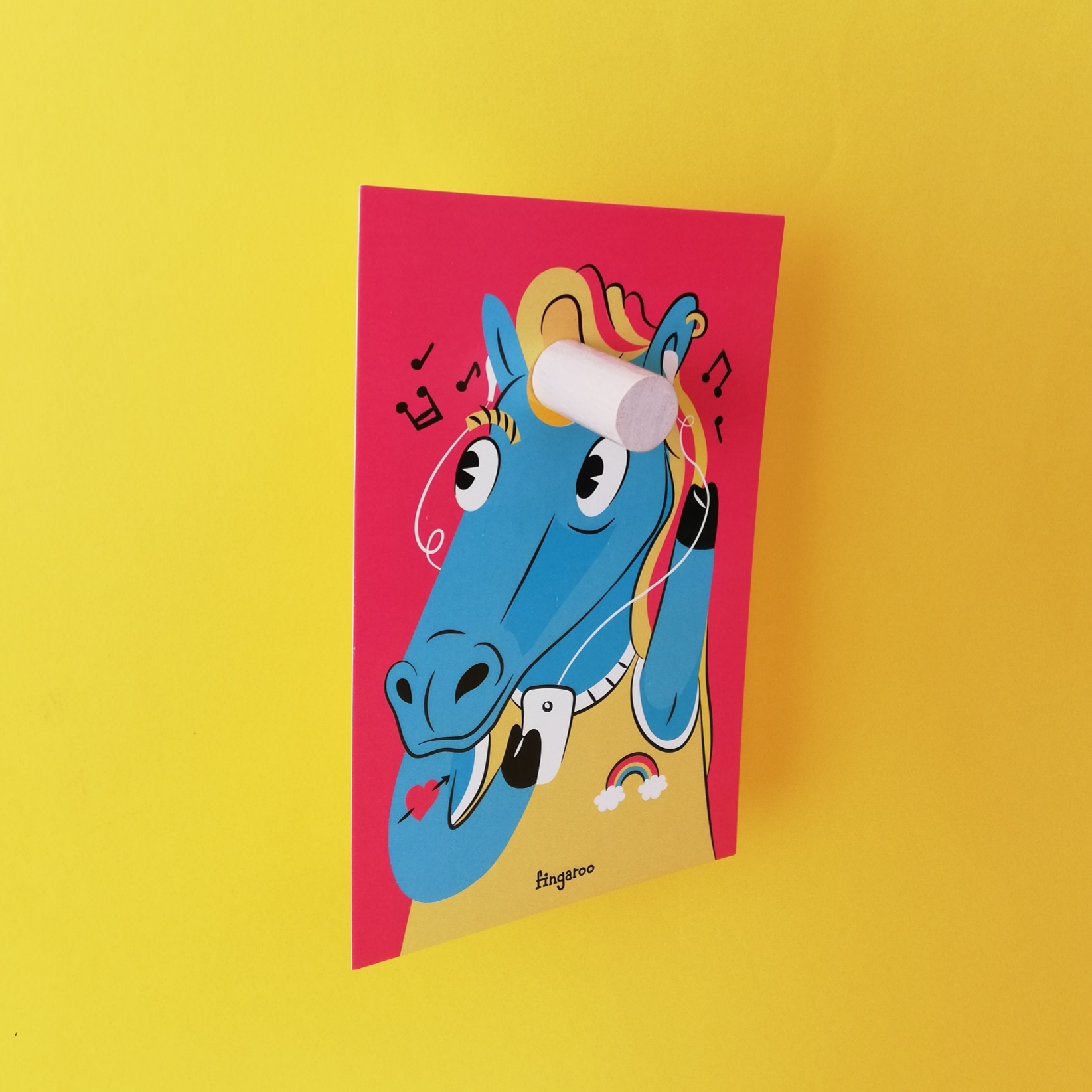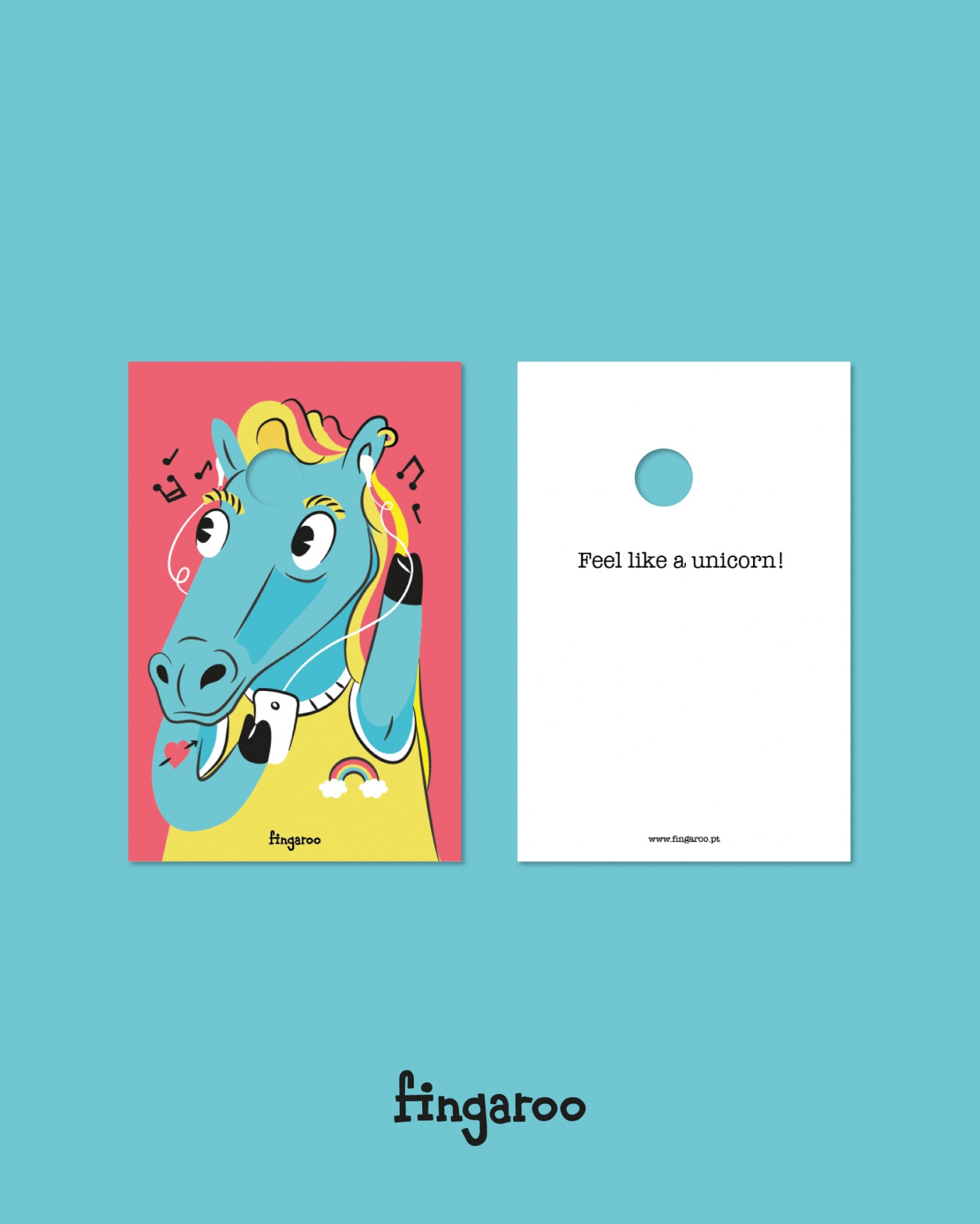 Fingaroo é uma uma série de postais-interactivos que incentivam à brincadeira, seja de crianças ou de adultos. Com um formato não convencional de 12x18cm e um furo peculiar, são postais com uma paleta de cores destinta, mas homogénea entre as suas 12 temáticas, no seu verso contém uma frase de cariz divertido, que apela à identificação das pessoas conforme o seu estado de espírito ou ocasião.