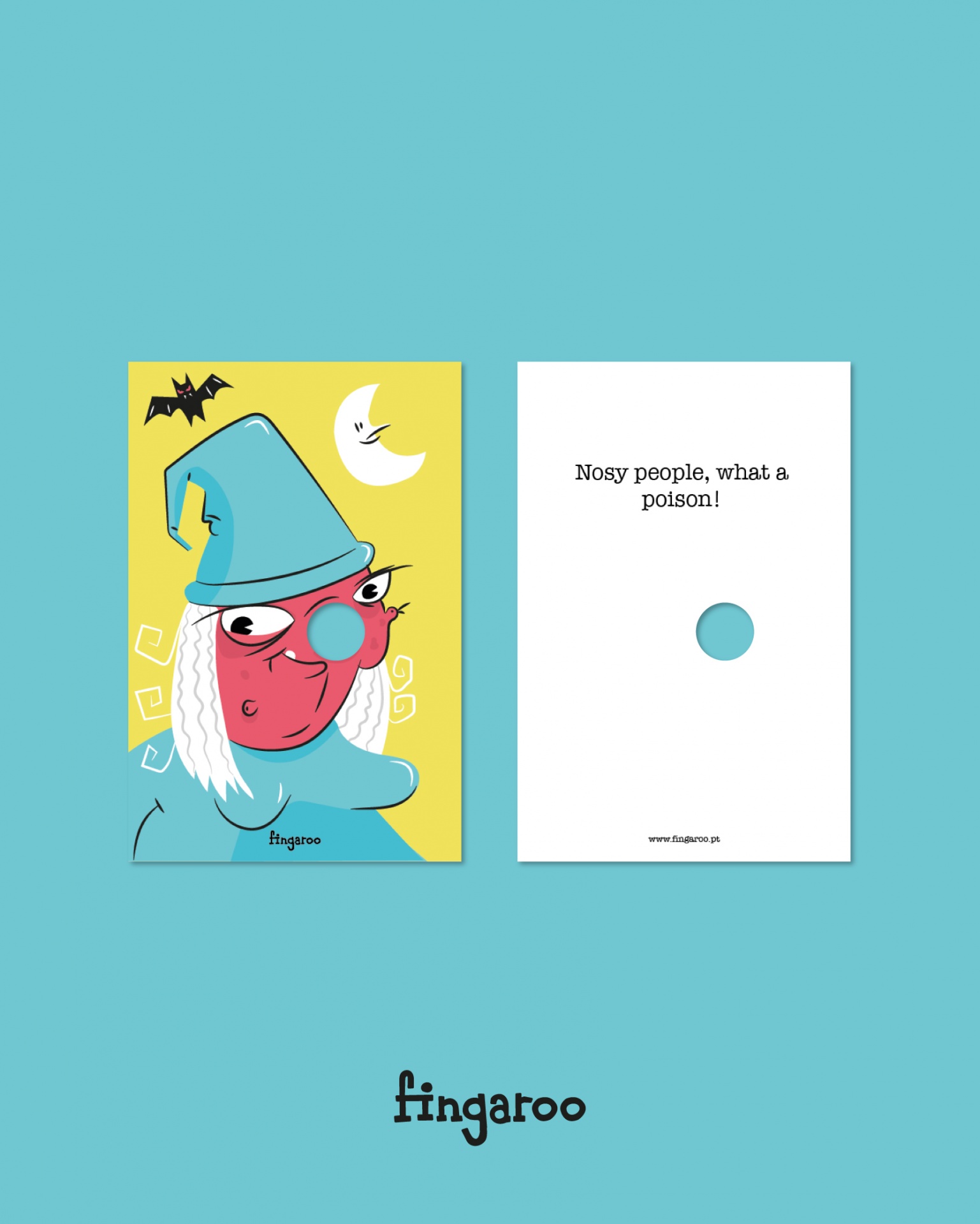 Com um formato não convencional de 12x18cm e um furo peculiar, são postais com uma paleta de cores destinta, mas homogénea entre as suas 12 temáticas, no seu verso contém uma frase de cariz divertido, que apela à identificação das pessoas conforme o seu estado de espírito ou ocasião.