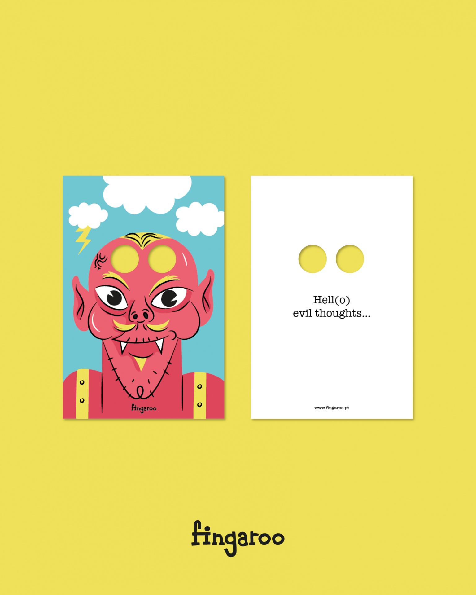 Dois cartões coloridos com ilustração de rosto vermelho e texto 'Hell(o) evil thoughts...' com fundo amarelo