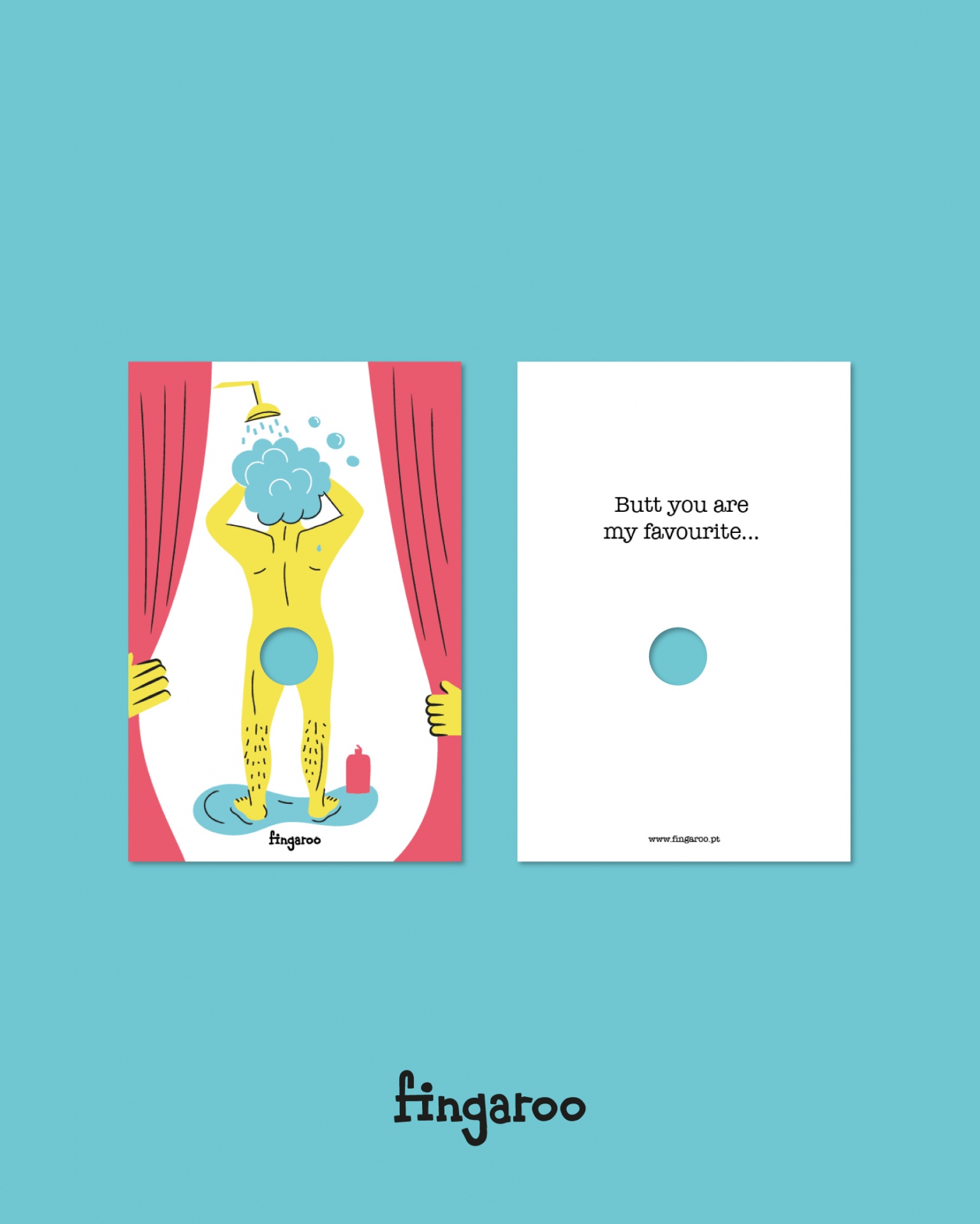 Fingaroo é uma uma série de postais-interactivos que incentivam à brincadeira, seja de crianças ou de adultos. Com um formato não convencional de 12x18cm e um furo peculiar, são postais com uma paleta de cores destinta, mas homogénea entre as suas 12 temáticas, no seu verso contém uma frase de cariz divertido, que apela à identificação das pessoas conforme o seu estado de espírito ou ocasião.