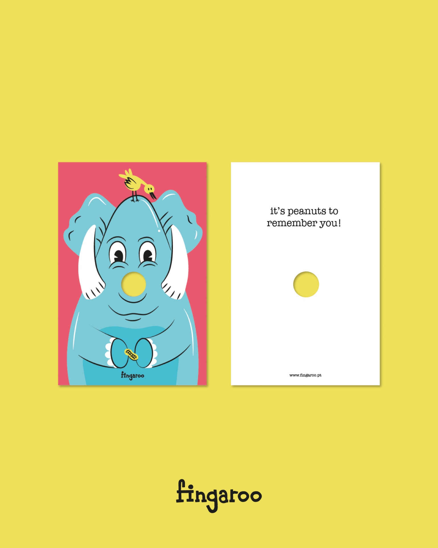 • Cartão ilustrado com elefante azul e texto 'It's peanuts to remember you!' em fundo amarelo